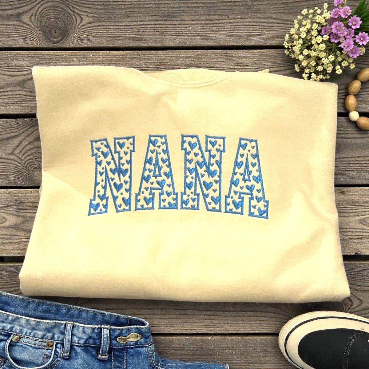 Get ready to fall in love with our Nana Embroidered Shirt! Our in-house stitched "Nana" design features a unique blend of reds and silver on a sweatshirt. Made with 100% pre-shrunk cotton and a slouchy fit, this shirt is perfect for any occasion. And with a mineral wash that makes each shirt unique, you'll stand out from the crowd. Don't wait, order now and spread the love!
